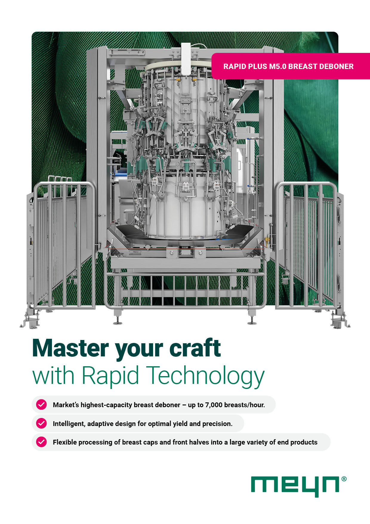 The Meyn Rapid Plus M5.0 is the market’s most advanced and high-capacity breast deboner. Backed by over 20 years of development, it builds on Meyn’s proven 180-degree carousel design to deliver precise handling, consistent positioning, extended processing time, and accurate cutting at speeds of up to 7,000 breasts per hour. Beyond top-tier performance, processors appreciate that the M5.0 is configurable to their specific needs — from a fully automated setup with simple configuration to advanced technology options, all with the flexibility to process either front halves or breast caps.