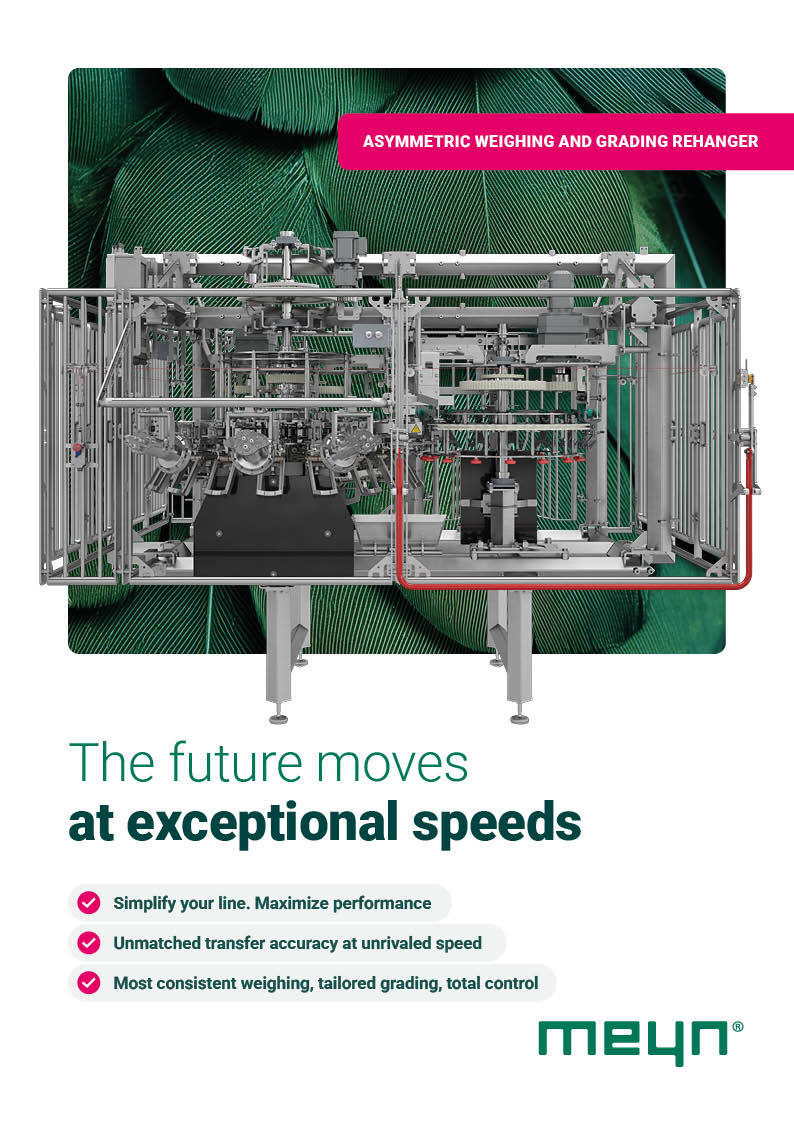 The Asymmetric Rehanger is the latest addition to Meyn’s leading rehanger solutions. The Meyn® Asymmetric Chill-Sort rehanger delivers the most reliable and accurate transfer performance, even at high process speeds. It seamlessly transfers birds from the 6" chilling line to the 8" sorting line shackles while maintaining full synchronization. This design virtually eliminates dropped birds and one-leg transfers. This together with the integrated high-precision weighing and the state-of-the-art Multi Vision bird grading ensures that birds can be perfectly distributed to the right destination at the highest processing speeds.