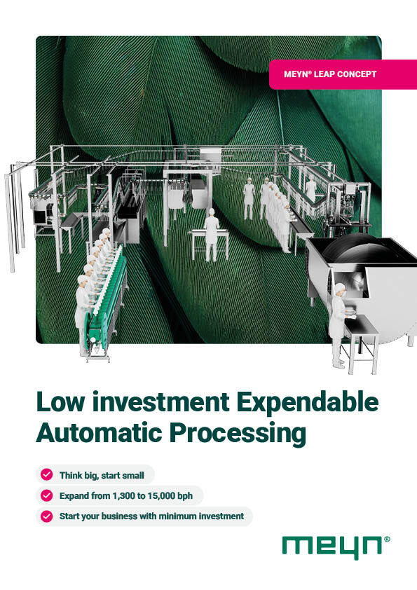 For poultry processors looking to start small and expand efficiently, the Meyn LEAP Concept offers a low-investment, high-yield solution. Nearly all equipment is upgradeable to 15,000 BPH, ensuring long-term cost savings.